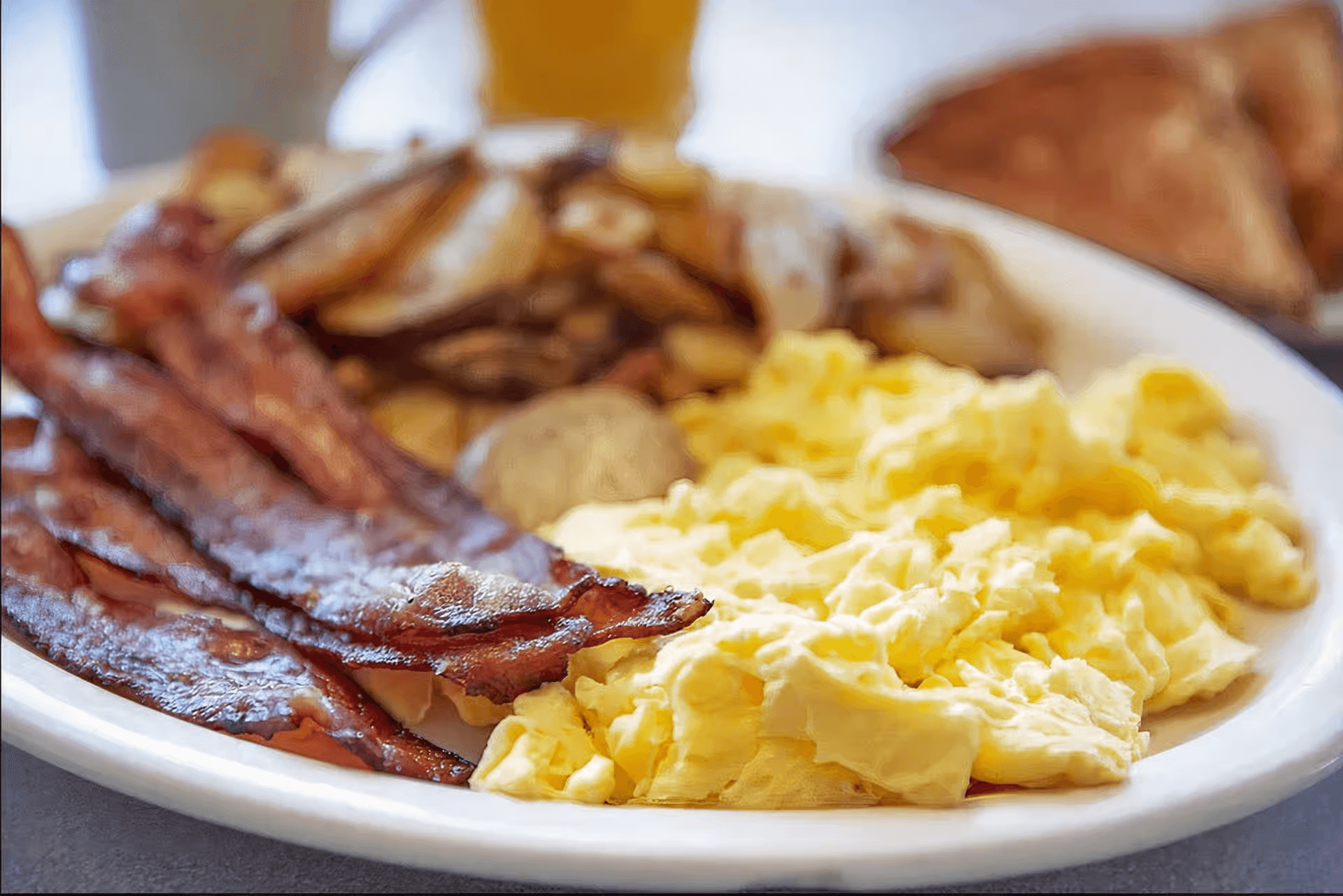 Enjoy the rich, smoky flavor of our Hickory Bacon Platter, featuring thick cut hickory smoked bacon cooked to crisp perfection. Served with farm fresh eggs and fluffy buttermilk pancakes, it is a hearty classic that starts your morning right.