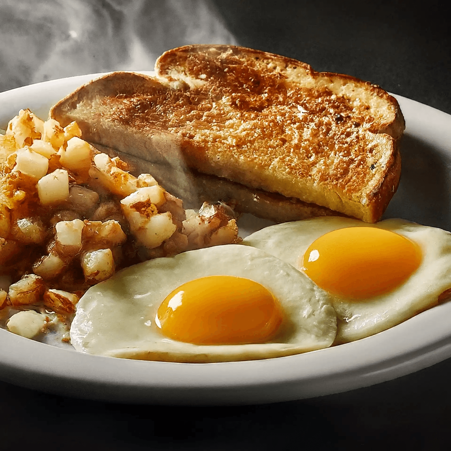 Start your morning with our classic 2 Egg Breakfast, featuring two eggs cooked your way. Served with golden hash browns and your choice of toast, bacon, or sausage, it is a simple and hearty favorite any day of the week.